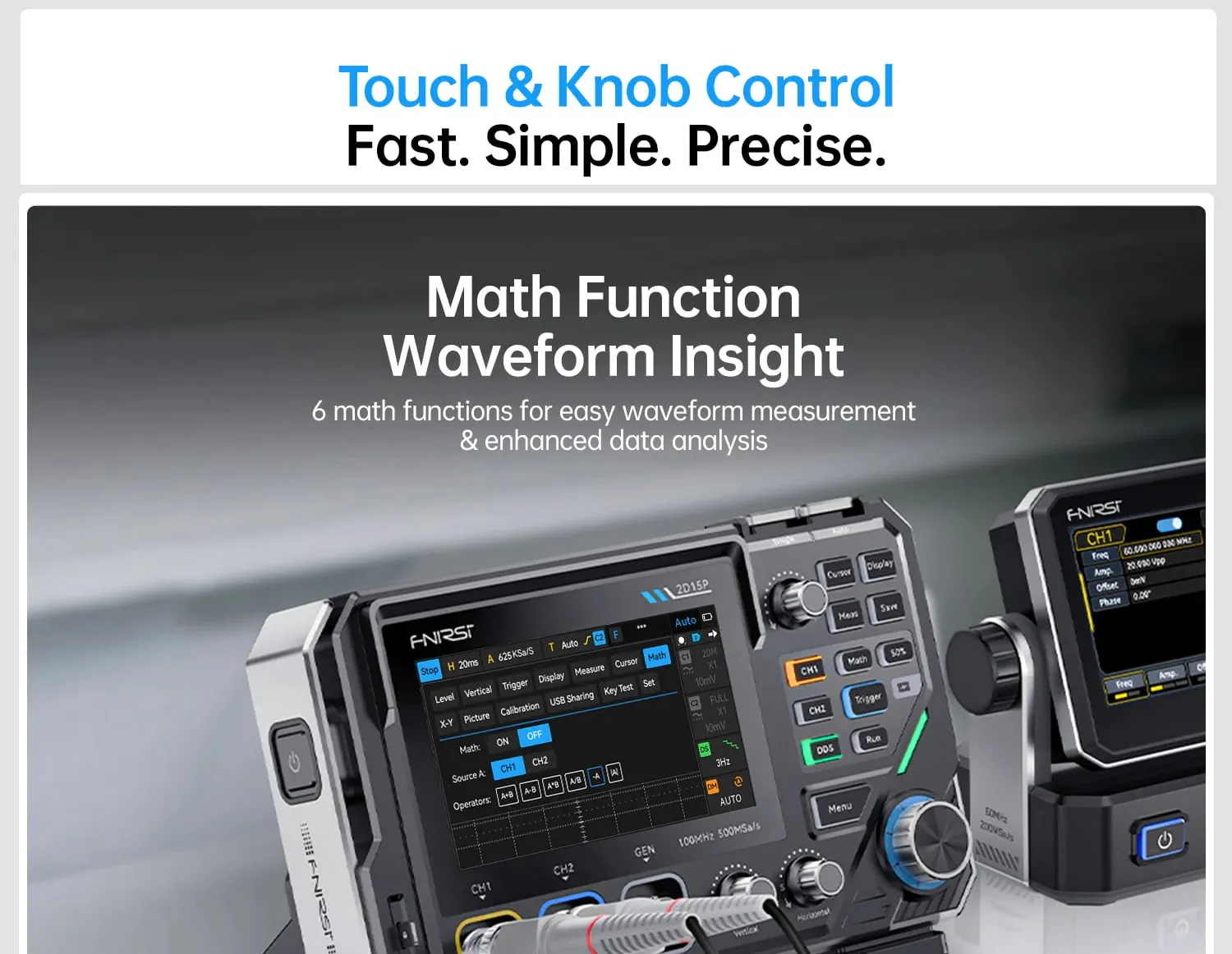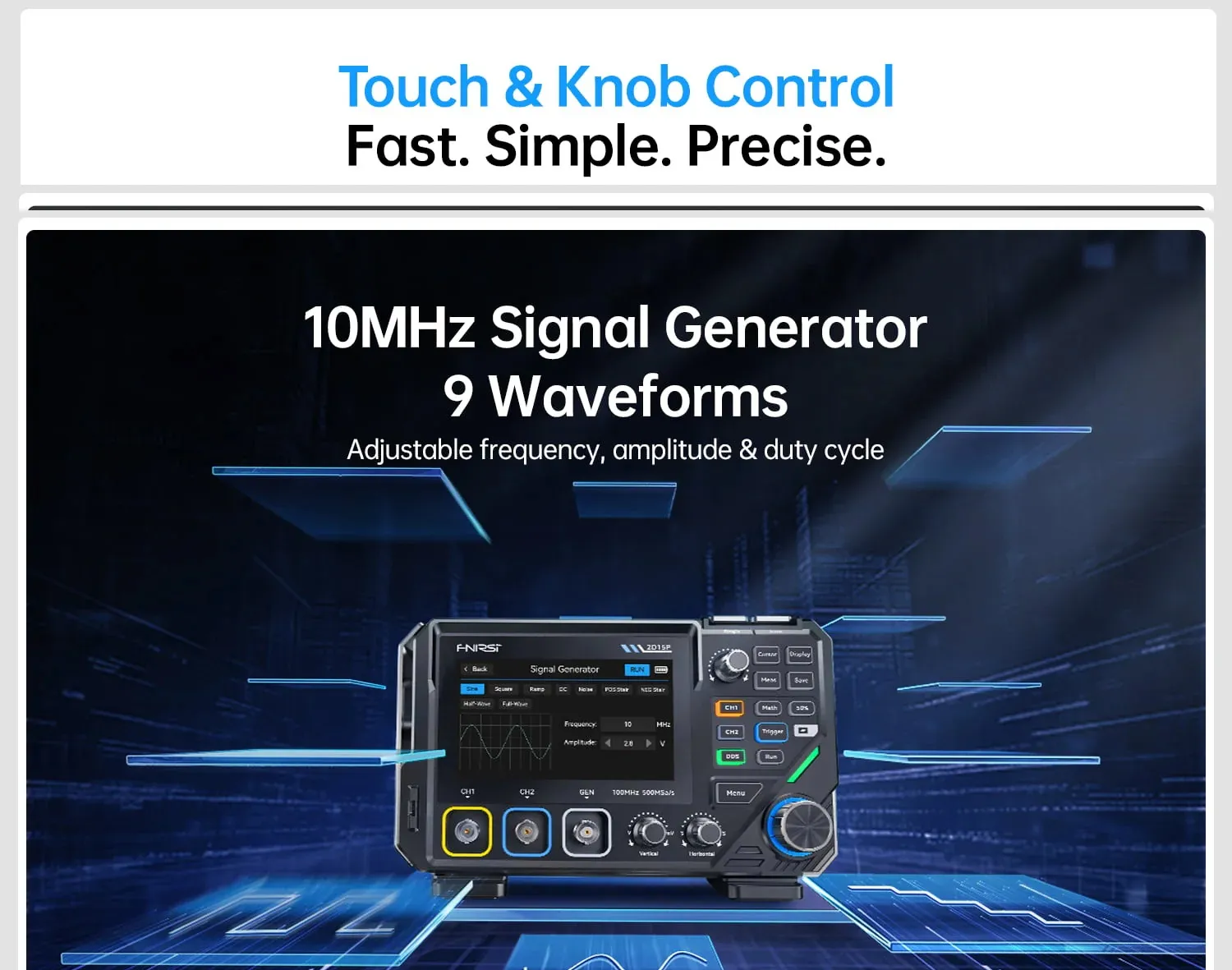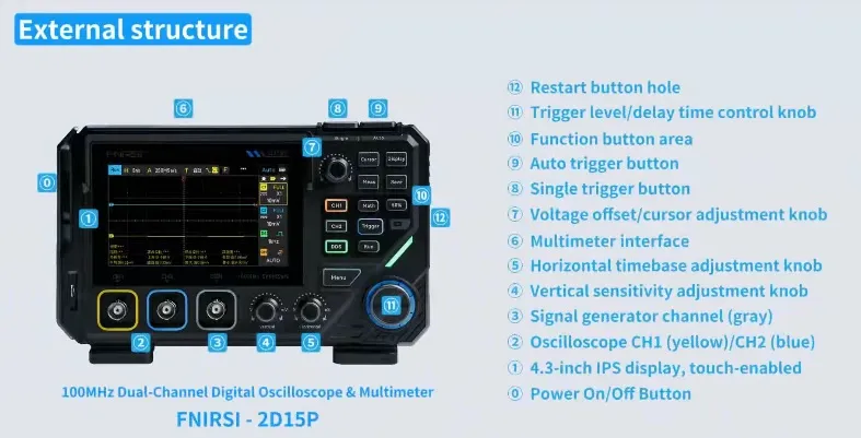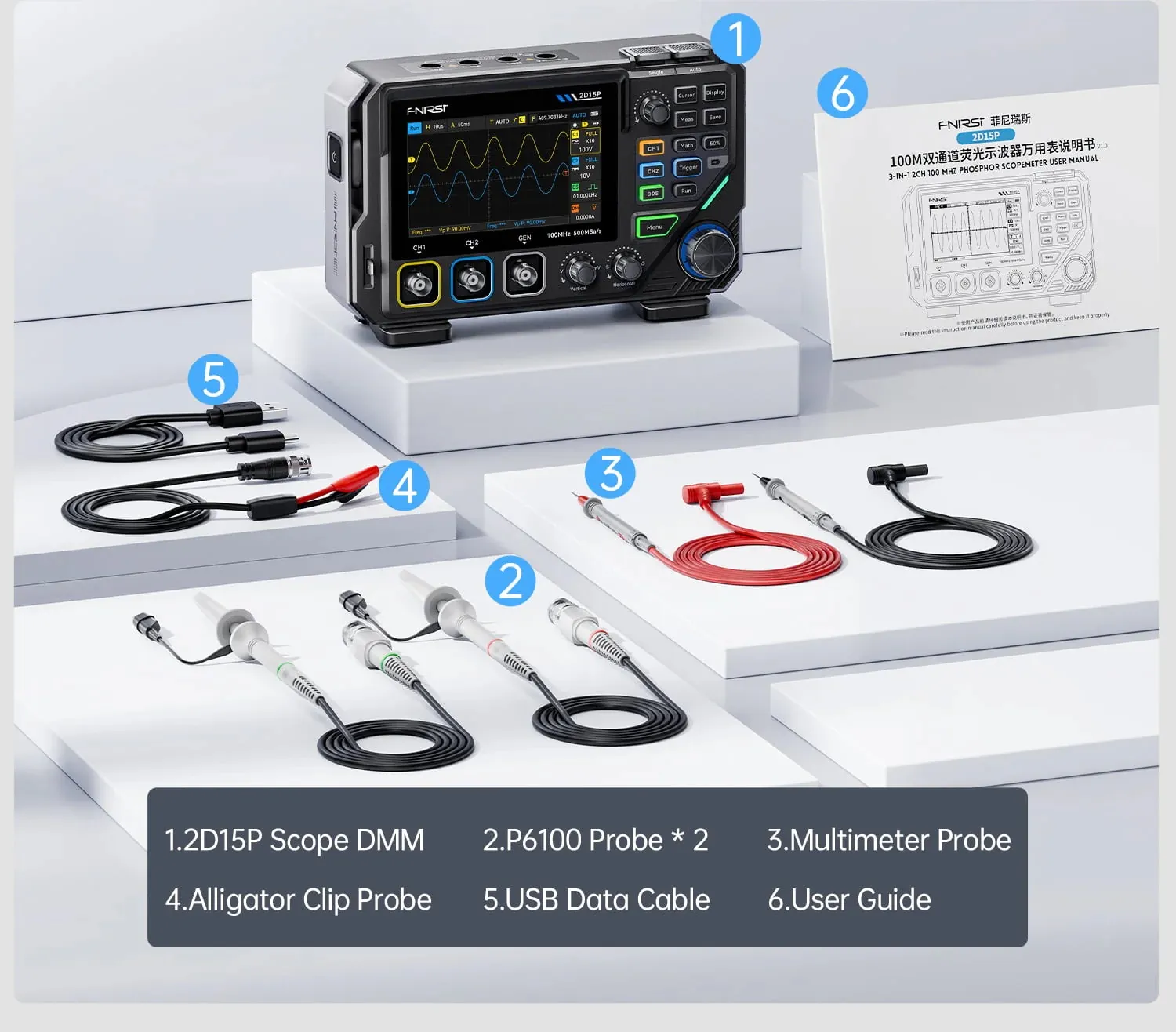 El FNIRSI 2D15P combina botones físicos con una pantalla táctil capacitiva de 4.3” Ofrece muestreo de 500 MS a/s, ancho de banda de canal único de 100 MHz (50 MHz doble canal) y profundidad de memoria de 10k 1M . Las características incluyen pantalla en escala de grises de 128 niveles, captura de forma de onda a 1200 fps, funciones matemáticas, 18 mediciones automáticas, generador de forma de onda de 10 MHz y multímetro True RMS de 19999 cuentas que soporta pruebas de voltaje, corriente, resistencia, capacitancia, diodo y continuidad.