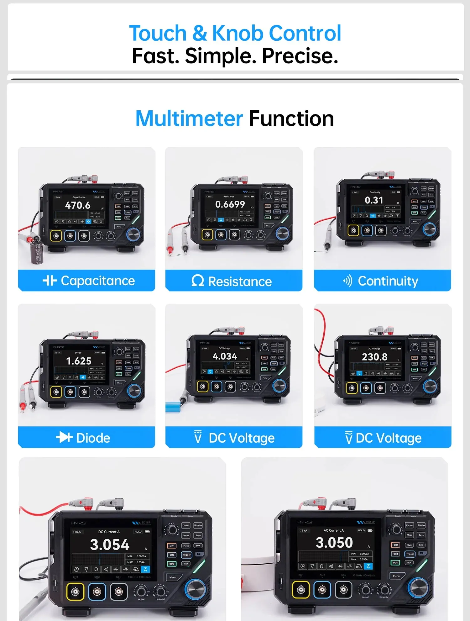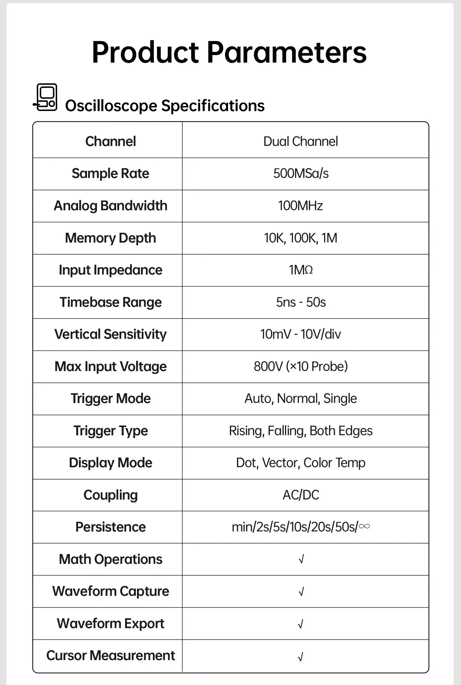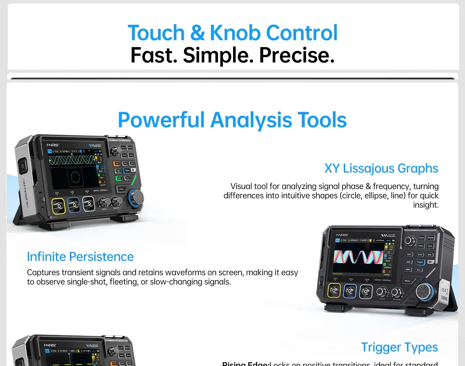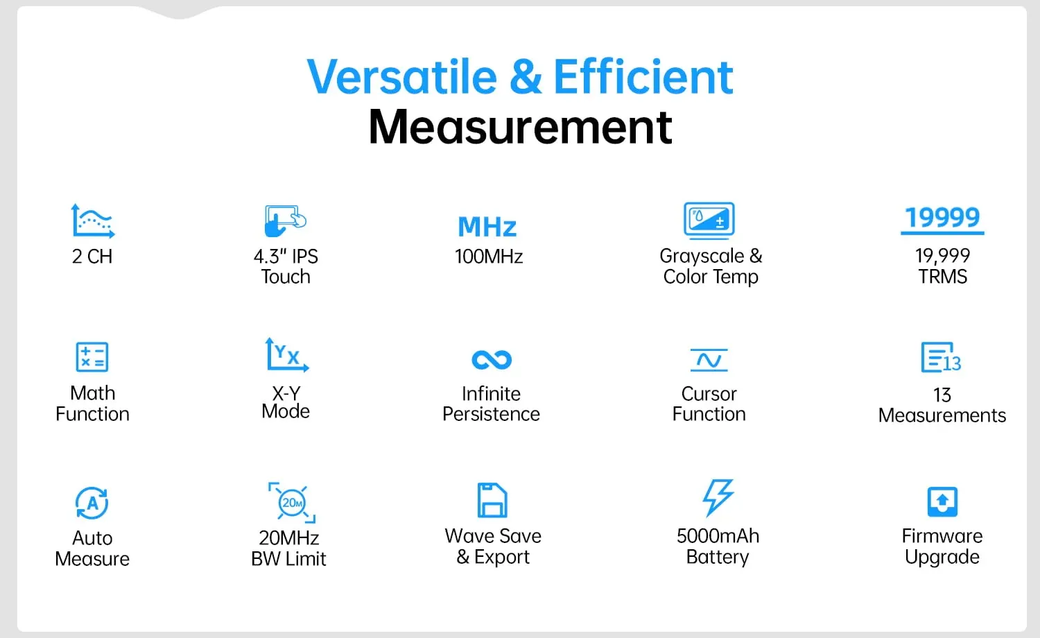 El FNIRSI 2D15P combina botones físicos con una pantalla táctil capacitiva de 4.3” Ofrece muestreo de 500 MS a/s, ancho de banda de canal único de 100 MHz (50 MHz doble canal) y profundidad de memoria de 10k 1M . Las características incluyen pantalla en escala de grises de 128 niveles, captura de forma de onda a 1200 fps, funciones matemáticas, 18 mediciones automáticas, generador de forma de onda de 10 MHz y multímetro True RMS de 19999 cuentas que soporta pruebas de voltaje, corriente, resistencia, capacitancia, diodo y continuidad.