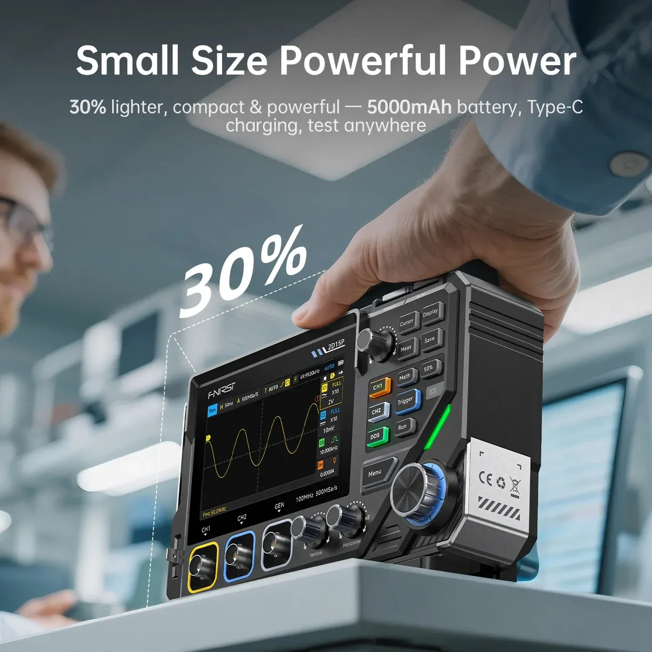 El FNIRSI 2D15P combina botones físicos con una pantalla táctil capacitiva de 4.3” Ofrece muestreo de 500 MS a/s, ancho de banda de canal único de 100 MHz (50 MHz doble canal) y profundidad de memoria de 10k 1M . Las características incluyen pantalla en escala de grises de 128 niveles, captura de forma de onda a 1200 fps, funciones matemáticas, 18 mediciones automáticas, generador de forma de onda de 10 MHz y multímetro True RMS de 19999 cuentas que soporta pruebas de voltaje, corriente, resistencia, capacitancia, diodo y continuidad.