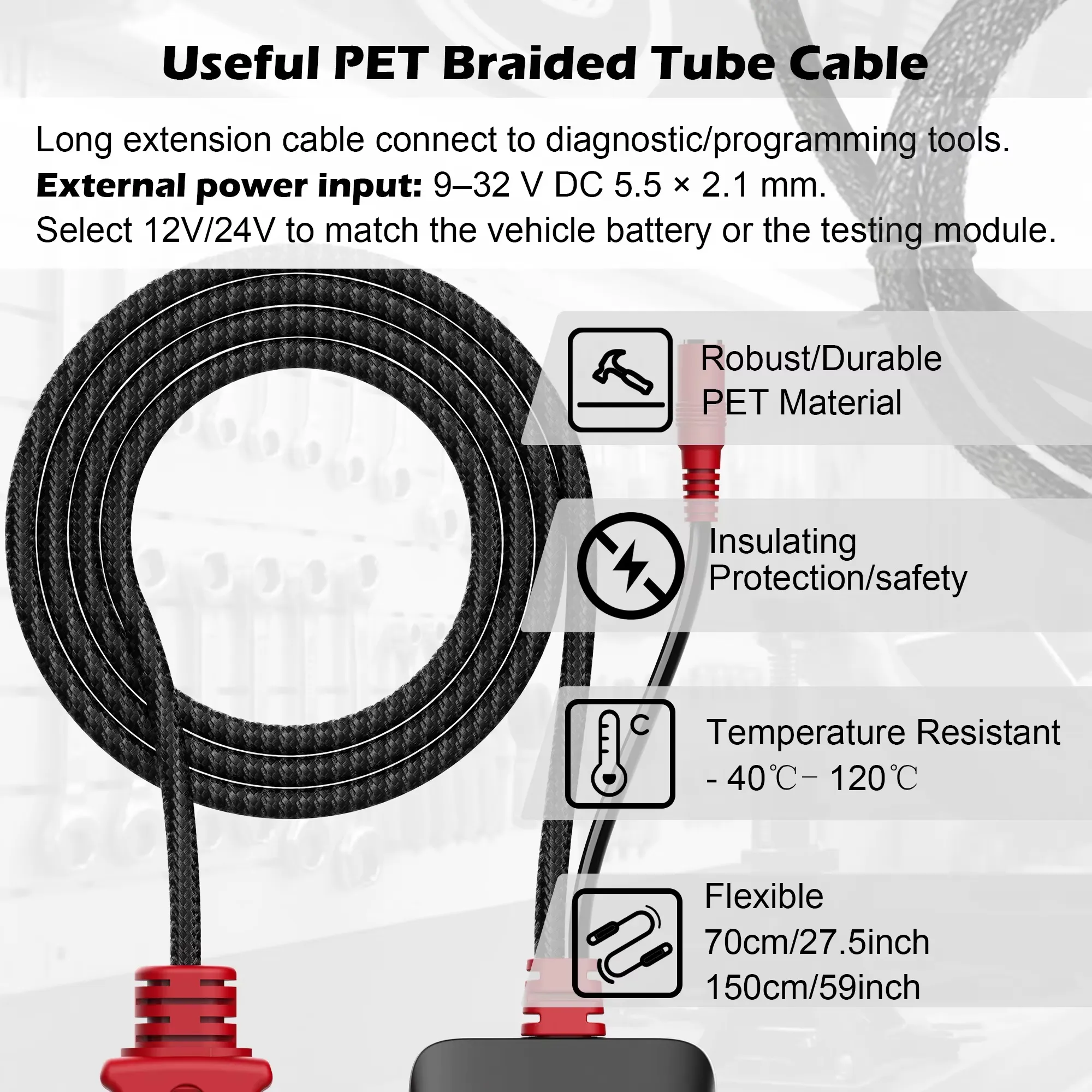 Cable de extensión de 70 cm para una conexión rápida a otras herramientas de diagnóstico/programación.